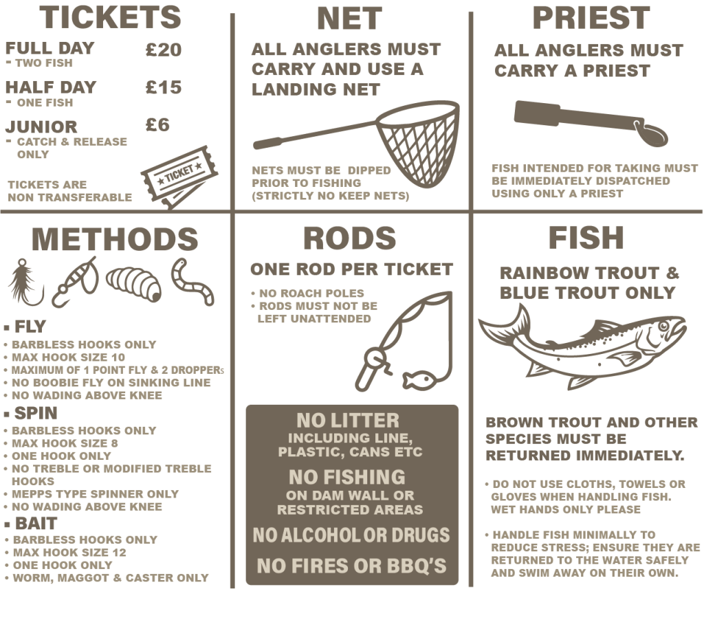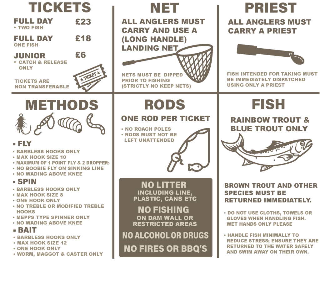 To ensure a safe and enjoyable fishing experience, we ask all anglers to follow a few basic guidelines. Please review the key rules below, and for the full list, refer to your ticket. By adhering to these rules, you'll help maintain a high standard of fishing and preserve the quality of our waters. Happy fishing!